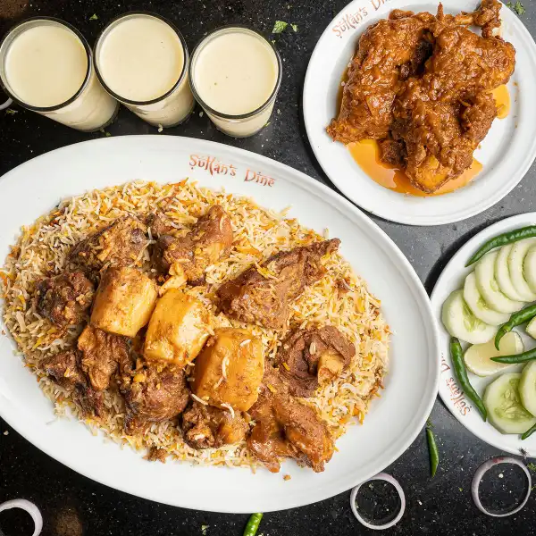 A delightful preparation of slow cooked aromatic basmati rice layered with potatoes & marinated mutton pcs. Served with chicken roast & borhani.