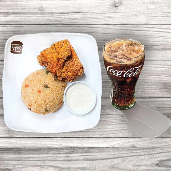 Lunch Deal 1: Fried rice with crispy fried chicken, savory sauce, and a refreshing glass of Coca-Cola.